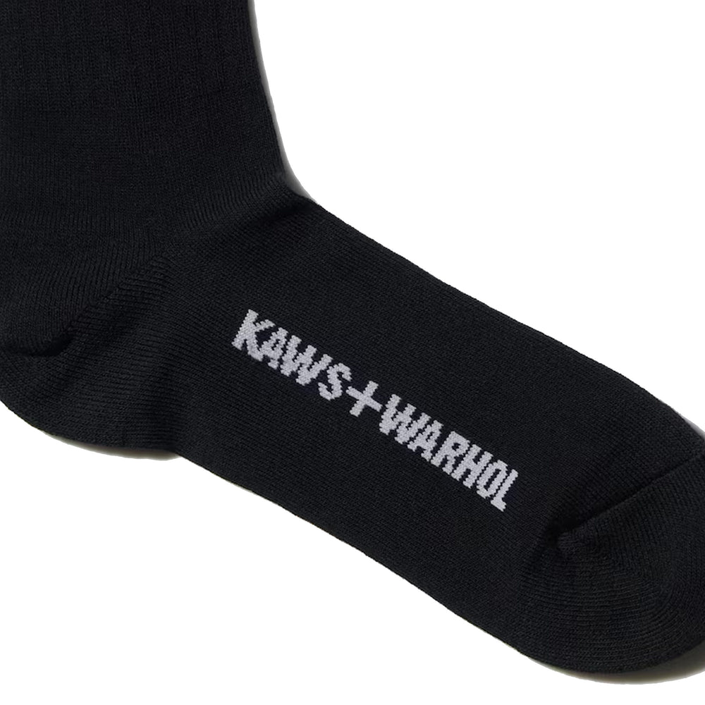 Featuring a classic black base, these socks are adorned with KAWS' signature graphic motifs, which pay homage to Warhol's influence on modern art. The design incorporates Warhol's celebrated pop art elements, reimagined through KAWS' distinct visual language. The high-quality fabric ensures both comfort and durability, making these socks not just a fashionable accessory, but a practical choice for everyday wear. The subtle yet impactful design elements blend seamlessly with the black background, creating a sophisticated and versatile addition to any wardrobe.