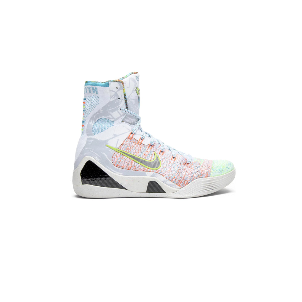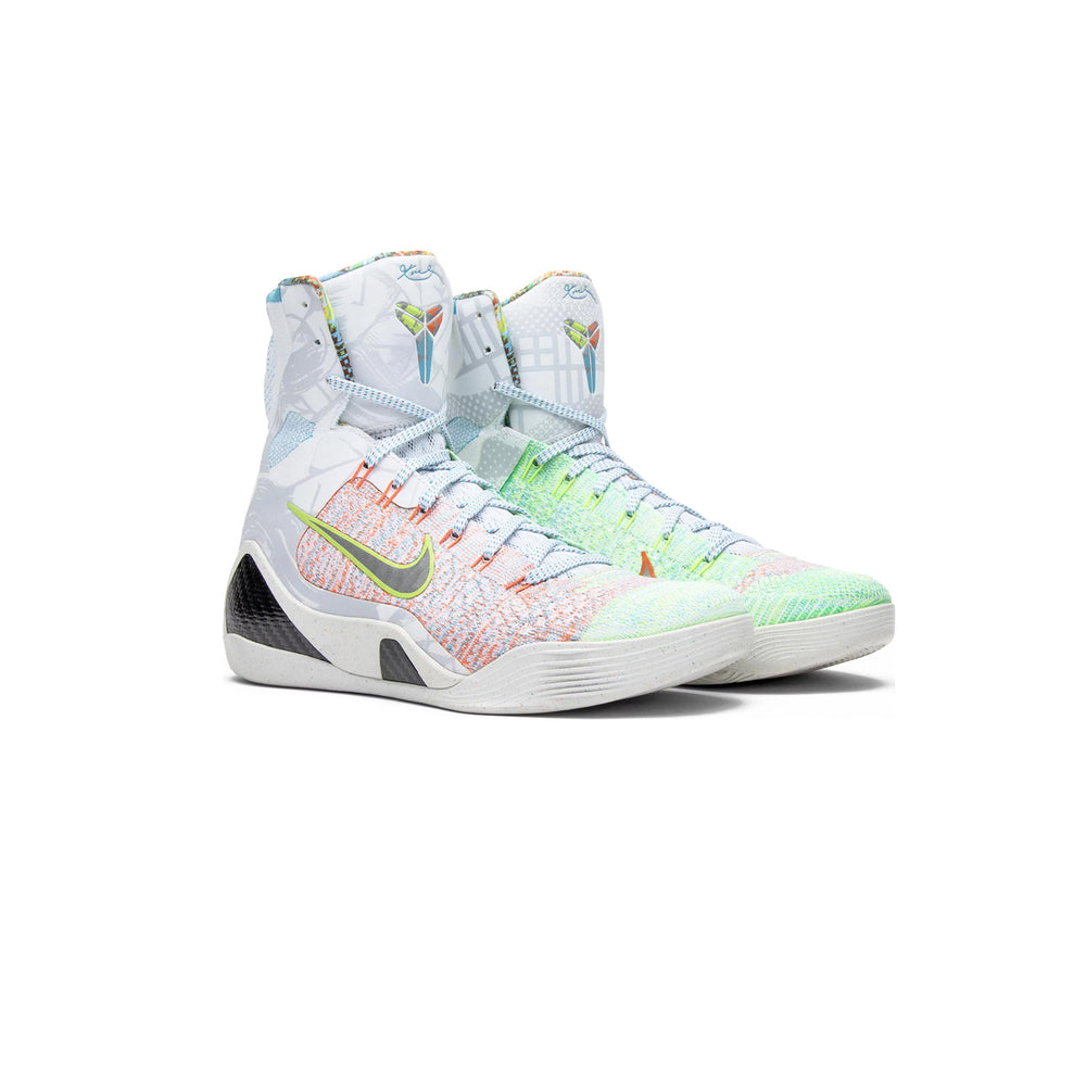 Overview The Nike Kobe 9 Elite 'What the Kobe' features a Flyknit upper that seamlessly combines a multitude of colors and patterns, reflecting the diverse inspirations and stories behind each previous Kobe 9 release. The high-top silhouette provides exceptional ankle support, while the Lunarlon midsole ensures superior cushioning and responsiveness. The sneaker's multi-colored design is complemented by bold accents and intricate detailing, making it a standout piece in any sneaker collection. The outsole, designed with a unique traction pattern, offers optimal grip and stability, essential for both on-court performance and off-court style.