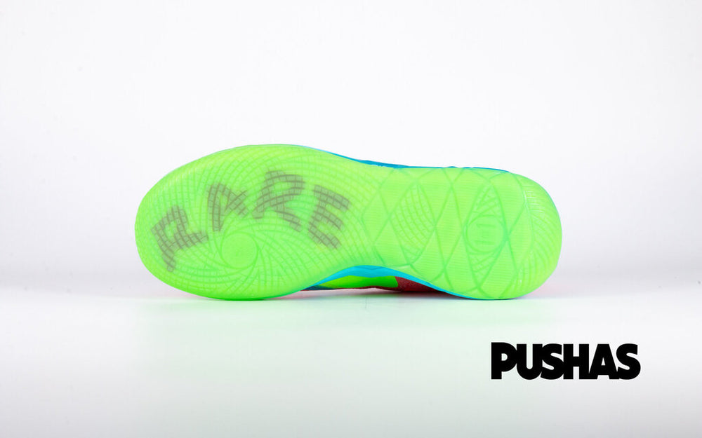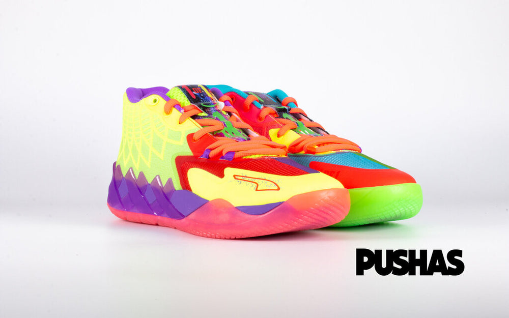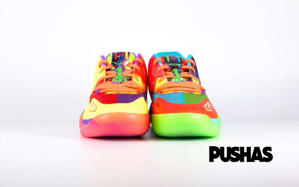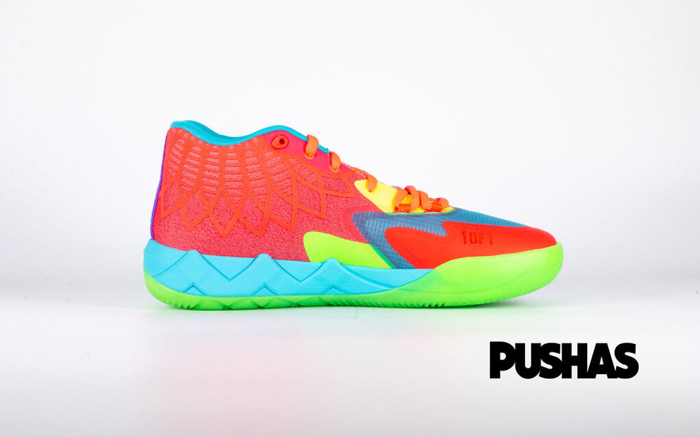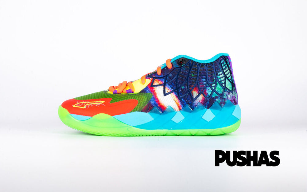 Buy the Puma MB.01 LaMelo Ball 'Be You' (2022) Although this PUMA MB.01 comes ready with galaxy details inspired by the aforementioned pair, this colorway takes things a step further with even more neon details than before. Each shoe has its own unique color placement complete with green, blue, yellow, purple, orange, pink, and everything in-between. The ripstop toebox has a two-tone finish as it’s split in half with varying colors. From there, the toebox is secured with a vibrant orange toecap on one shoe, and neon yellow on the other. The back half of the shoe also goes for the mismatched look, pairing different highlighter tones with galaxy print. Other notable details include “1 of 1” branding on the tongue, a “Be You” graphic on the base of the laces, and “Rare” printed on the outsole.