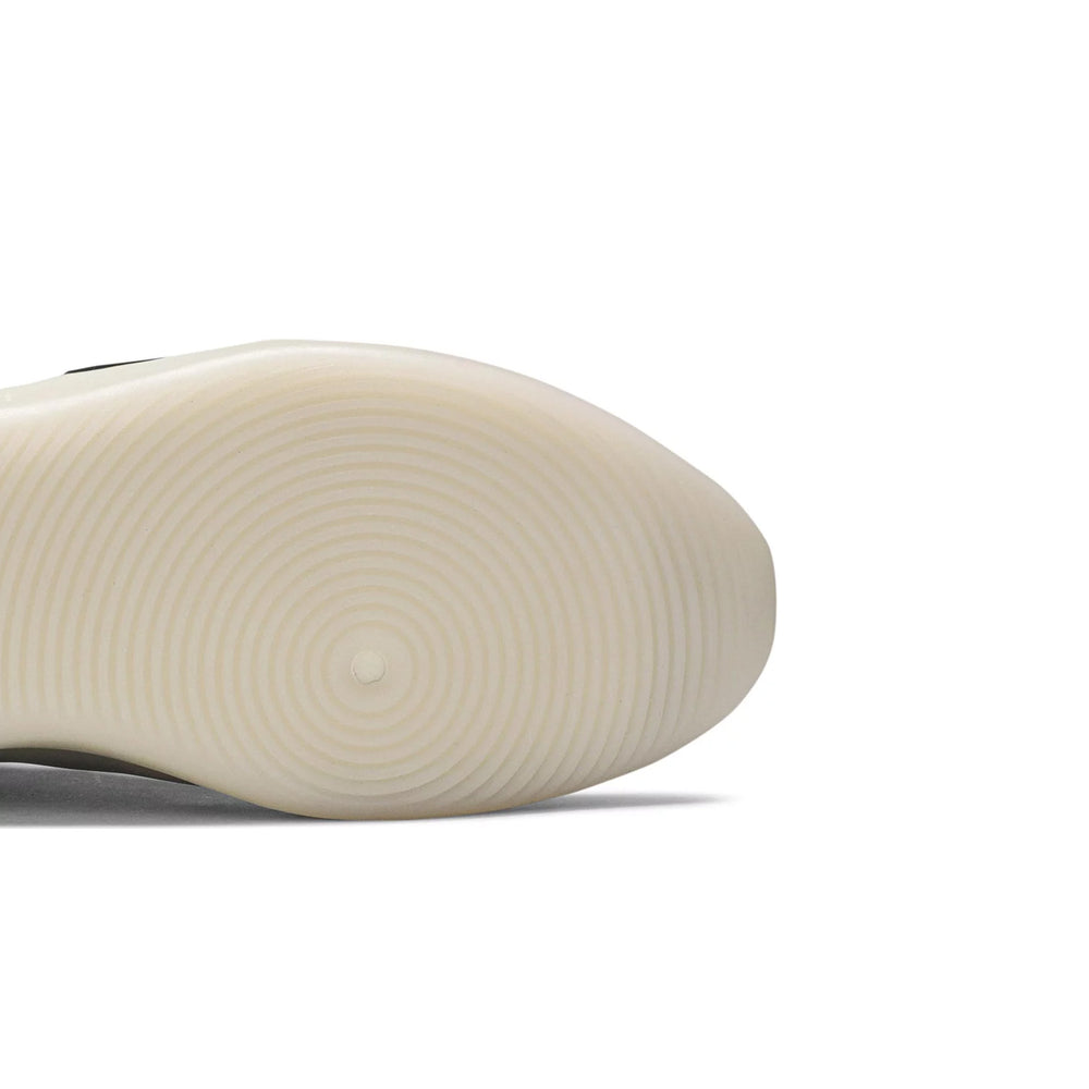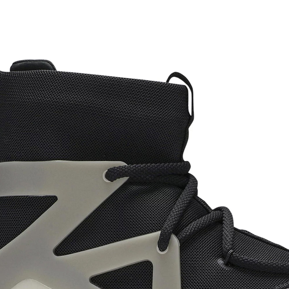 The Nike Air Fear of God 1 'String The Question' features a minimalist yet impactful design, highlighted by its premium materials and attention to detail. The upper is constructed from a mix of high-quality suede and mesh, providing both durability and breathability. The "String" beige hue dominates the shoe, offering a versatile, neutral base that complements any outfit. This is contrasted by the black TPU cage, which not only adds structural integrity but also echoes the design of the classic Huarache Light, another iconic Nike model. The midsole is equipped with a double-stacked Zoom Air unit, ensuring superior cushioning and responsiveness, essential for both on-court performance and off-court style. The sneaker is completed with a thick, sculpted sole that underscores its modern aesthetic while providing optimal support.