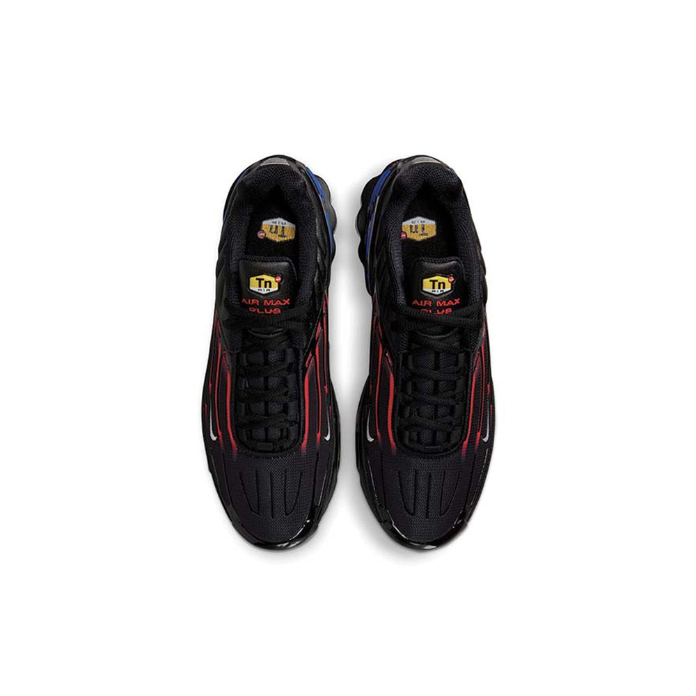 The sneaker's upper boasts a striking combination of black mesh and synthetic overlays, adorned with vibrant red and blue accents reminiscent of Spider-Man's iconic suit. The signature wavy lines of the Air Max Plus TN are reimagined to mimic the intricate web patterns, creating a visually captivating design that pays homage to the superhero's agile and powerful persona. The "TN" branding on the heel and the midfoot shank shines in metallic silver, adding a touch of modern elegance. A gradient fade on the midsole transitions from deep red to blue, enhancing the shoe's dynamic appeal, while the classic Max Air cushioning ensures superior comfort and responsiveness.