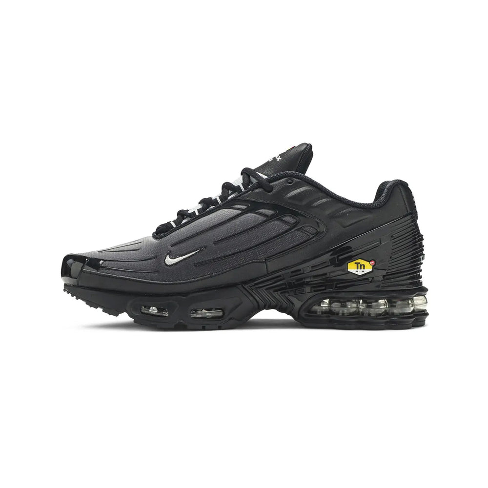 The Nike Air Max Plus TN 3 'Stencil Swoosh Black' showcases a sleek, tonal black mesh upper, complemented by premium leather overlays for enhanced durability. The standout feature of this model is the bold "Stencil Swoosh" logo on the lateral side, adding a rebellious touch to the iconic silhouette. This design innovation is paired with the signature Air Max cushioning technology, ensuring superior comfort with every step. The shoe’s sleek black colorway is offset by reflective accents that enhance visibility and elevate its futuristic appeal. The midsole features the classic Tuned Air cushioning system, delivering responsive support for all-day wear. With its combination of performance technology and urban style, the Air Max Plus TN 3 'Stencil Swoosh Black' is designed to make a statement both on the streets and in the gym.