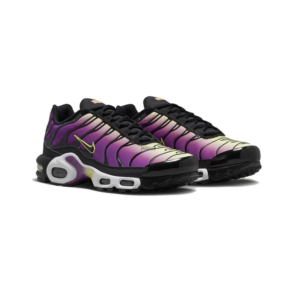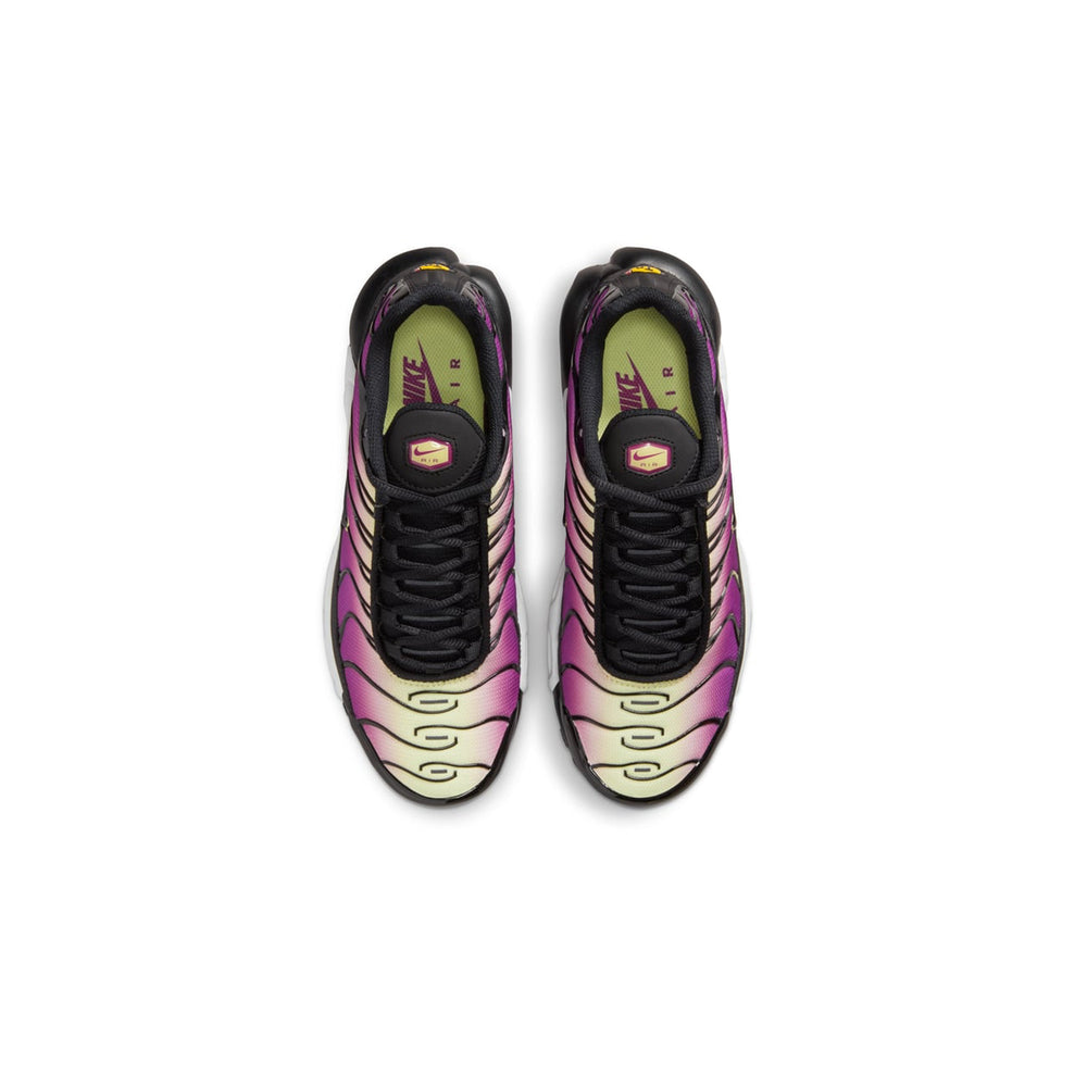 The 'Bold Berry Citron Tint' features a dynamic "Bold Berry" mesh upper, providing both breathability and a striking visual appeal. The synthetic overlays are rendered in a contrasting "Citron Tint," creating a harmonious balance between bold and subtle hues. The shoe’s signature Tuned Air technology is visibly integrated into the sole unit, ensuring superior cushioning and support, which is perfect for both athletic and casual wear. Nike's iconic Swoosh, in a sleek silver, accents the side panels, adding a touch of elegance to the vibrant design. The gradient midsole transitions from dark to light, reflecting the innovative spirit of the Air Max Plus series.