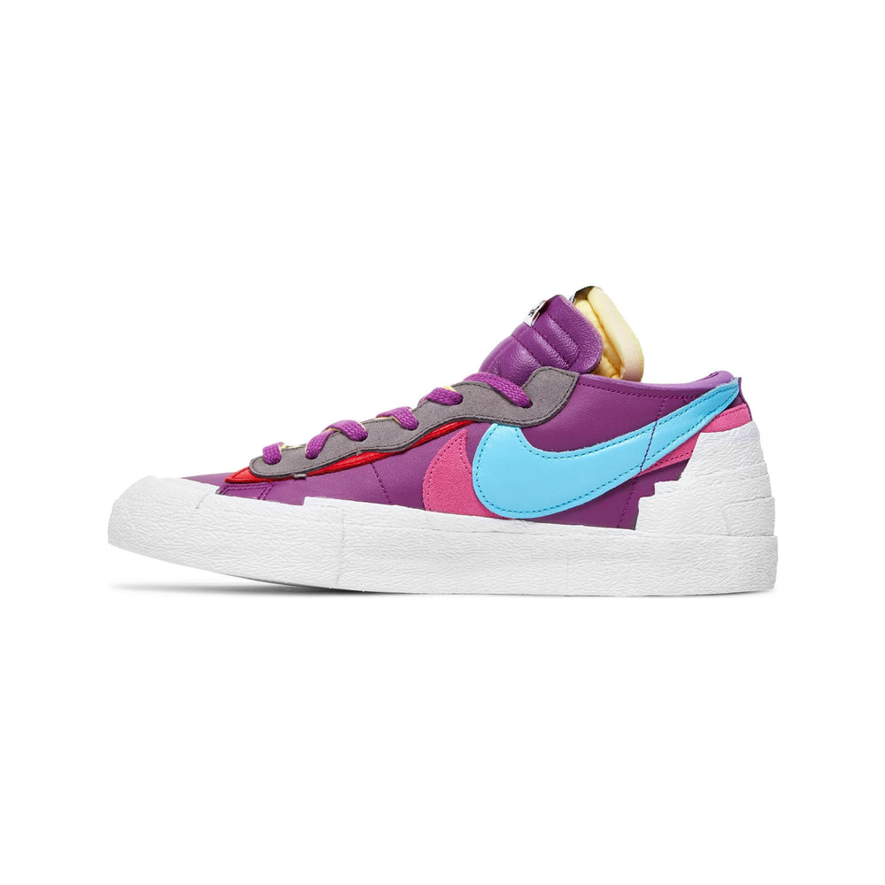 The Nike Blazer Low Sacai KAWS 'Purple Dusk' (2021) brings together two powerhouse collaborators in a unique design that pushes the boundaries of traditional sneaker aesthetics. Combining Sacai’s signature double-layering technique with KAWS’ bold, colorful artistry, this limited-edition release from the Nike x Sacai x KAWS partnership redefines the Nike Blazer Low silhouette. The shoe blends KAWS' vibrant palette with Sacai's deconstructed look, creating a modern, artistic twist on a timeless design.