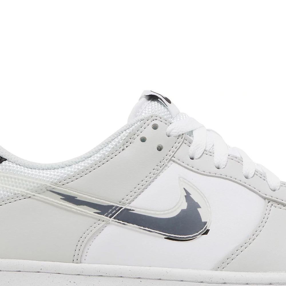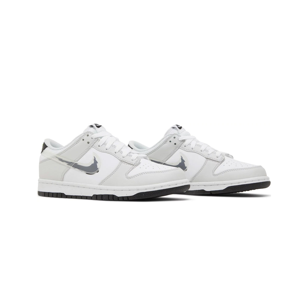 The Nike Dunk Low 'Glitch Swoosh' GS features a sleek leather upper, combining crisp white and deep black panels for a stark, high-contrast look. The standout feature is the Swoosh, which appears in a 'glitch' effect, blending shades of blue and grey to create a dynamic visual experience. This unique design element symbolizes the fusion of digital and physical realms, capturing the essence of today's tech-savvy generation. The sneaker is completed with a white midsole and a black rubber outsole, ensuring both comfort and durability for everyday wear.