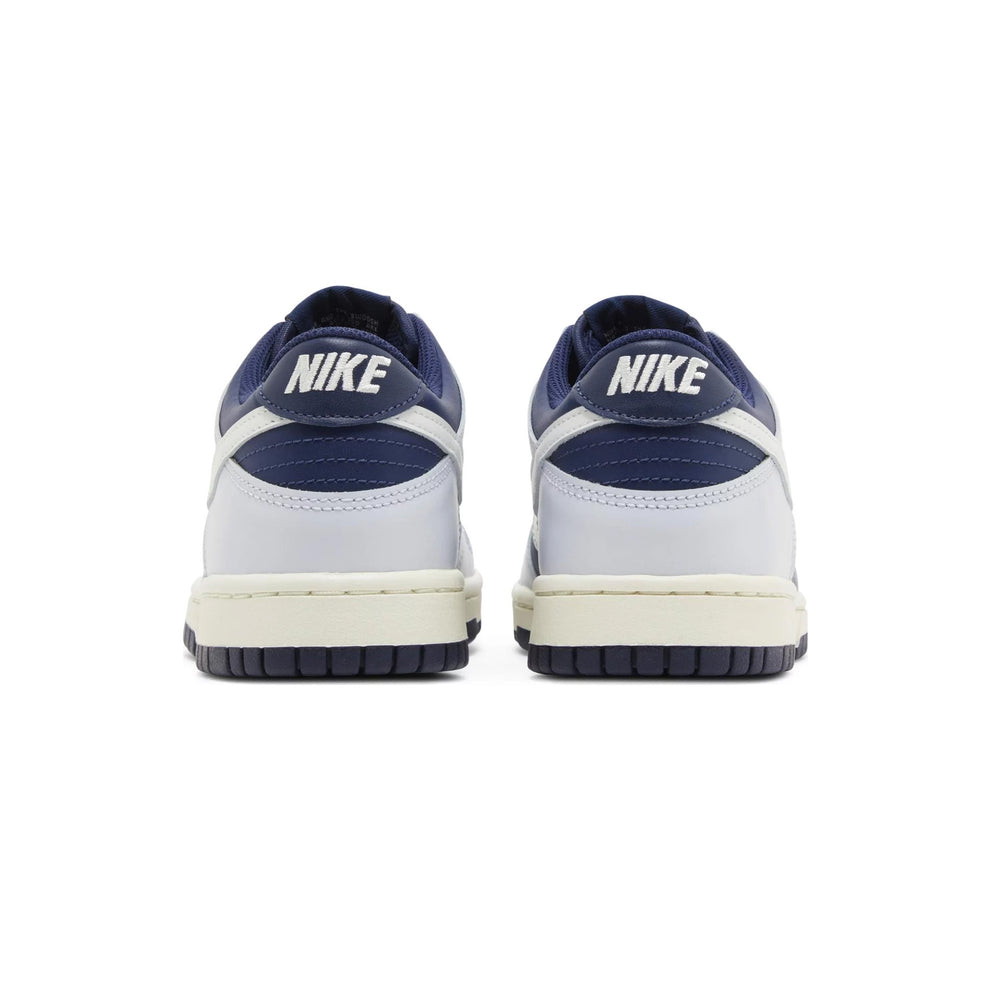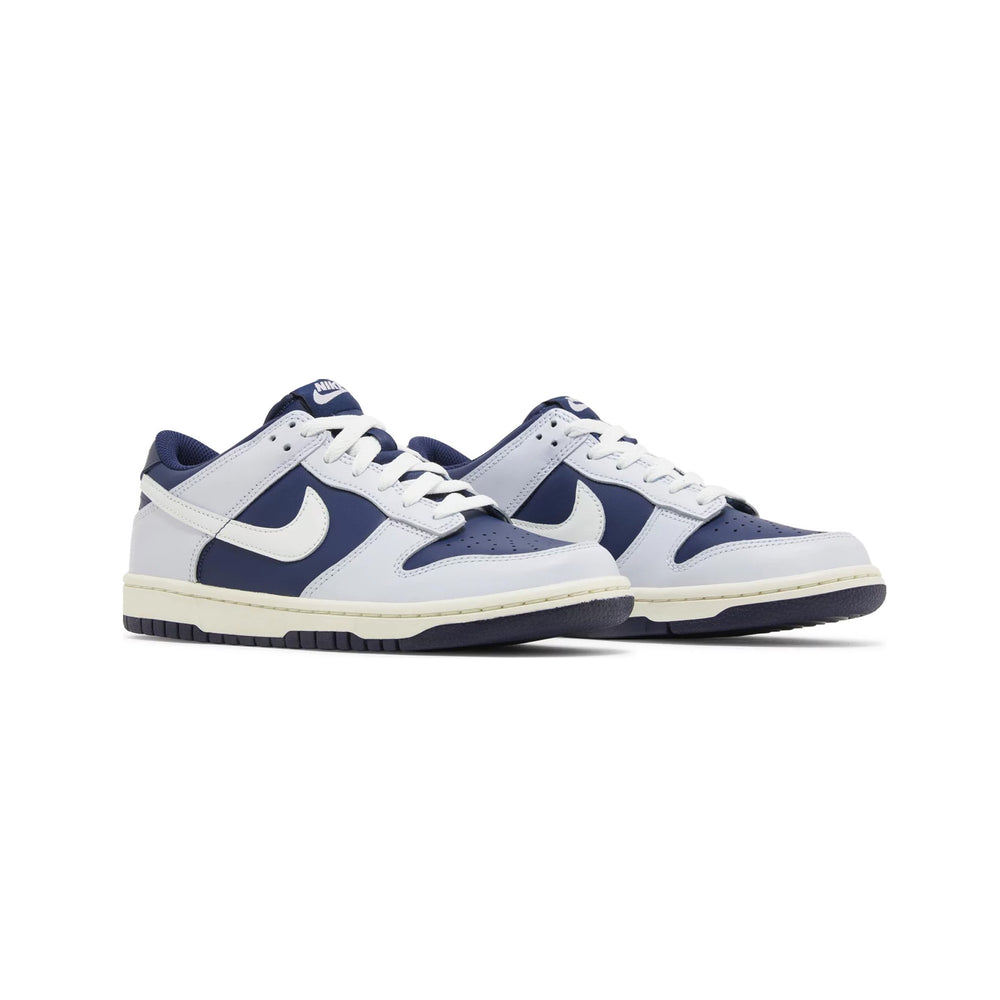 Crafted with a premium leather upper, the Nike Dunk Low GS 'Football Grey Navy' features a harmonious palette of subtle yet striking hues. The 'Football Grey' leather base exudes a sense of understated elegance, while the 'Navy' overlays add depth and contrast, creating a visually appealing balance. The signature Nike Swoosh in navy seamlessly integrates into the design, extending from the midfoot to the heel, highlighting the sneaker's streamlined profile. A crisp white midsole enhances the overall aesthetic, providing a clean break between the upper and the navy outsole, which offers exceptional traction and durability. The padded collar and cushioned insole ensure comfort and support, making this sneaker an ideal choice for all-day wear.