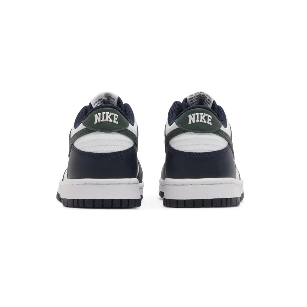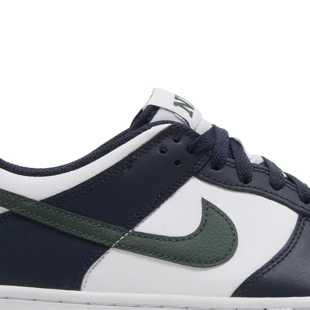 The Nike Dunk Low 'Obsidian Vintage Green' GS features a captivating combination of a rich obsidian blue base with vintage green accents. The upper is constructed from high-quality leather, ensuring durability and a premium look. The obsidian hue dominates the toe box, side panels, and collar, while the vintage green overlays add a refreshing contrast, wrapping around the mudguard, eyelets, and heel. A classic white midsole enhances the clean aesthetics, paired with a green rubber outsole for reliable traction and style. The signature Nike Swoosh is prominently displayed in vintage green, harmonizing with the overall design. Additional details include a padded collar and tongue for extra comfort and a secure fit, making these sneakers perfect for all-day wear.