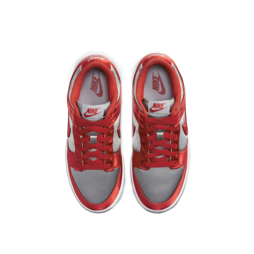 The Nike Dunk Low 'Satin UNLV' Women's (2023) showcases a sophisticated fusion of traditional and modern design elements. Featuring a smooth satin upper, the sneaker is enveloped in bold "University Red" overlays, complemented by a striking "Medium Grey" base. This dynamic color palette is reminiscent of the UNLV Runnin' Rebels, celebrating the rich heritage of college basketball. The satin material adds a touch of luxury and sheen, ensuring the shoe stands out in any sneaker collection. Enhanced by a classic white midsole and a durable red rubber outsole, the design ensures both style and functionality. The Nike branding on the tongue and heel, along with a padded collar and cushioned insole, provides superior comfort and support for everyday wear.