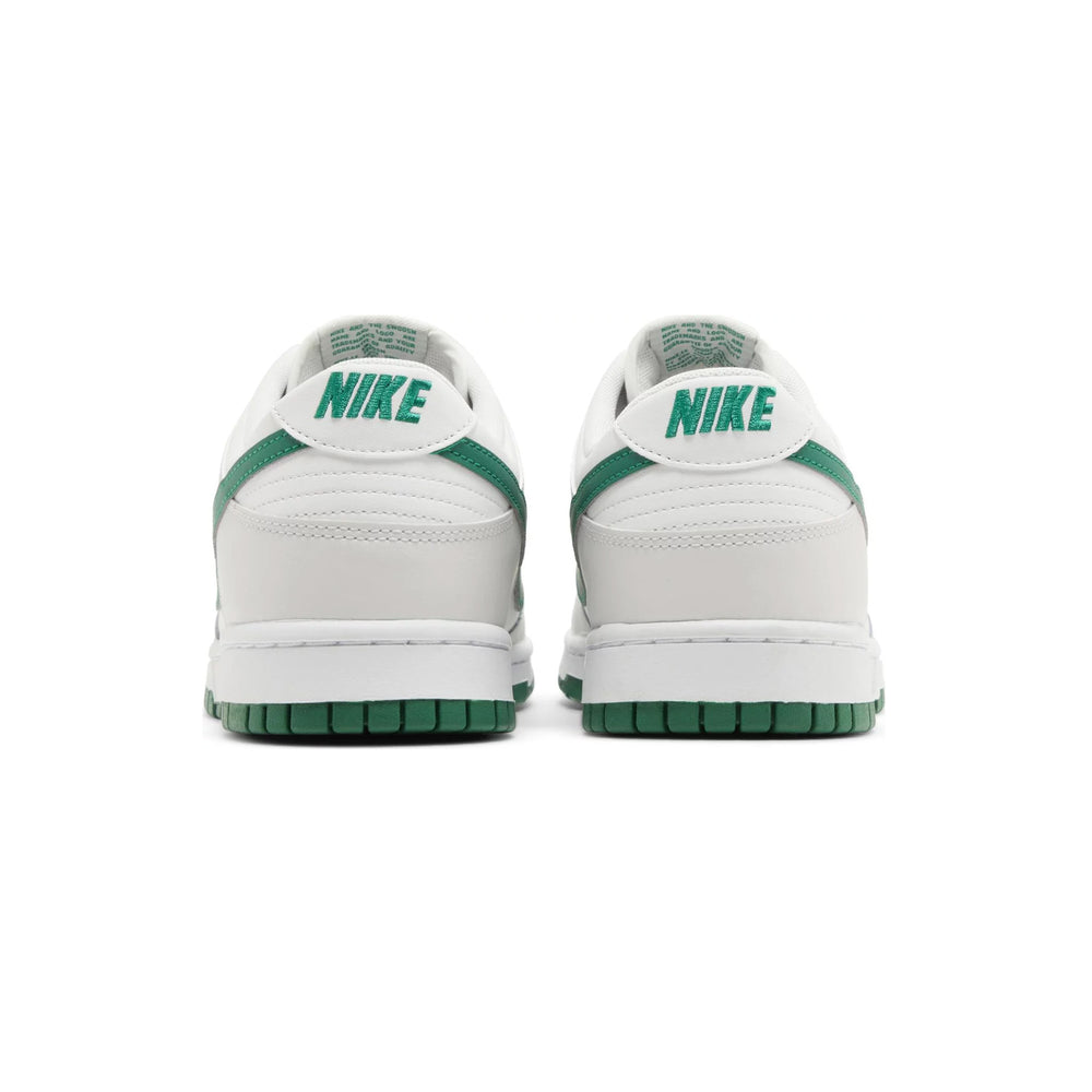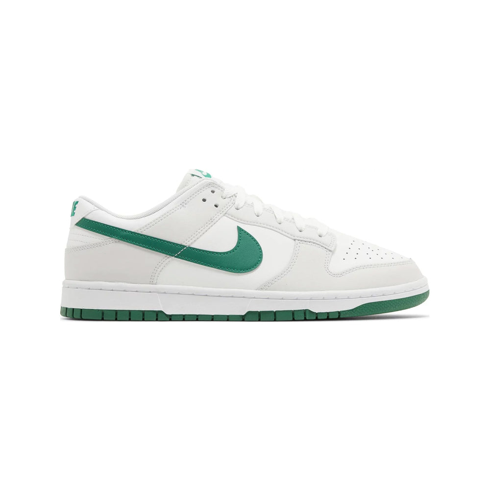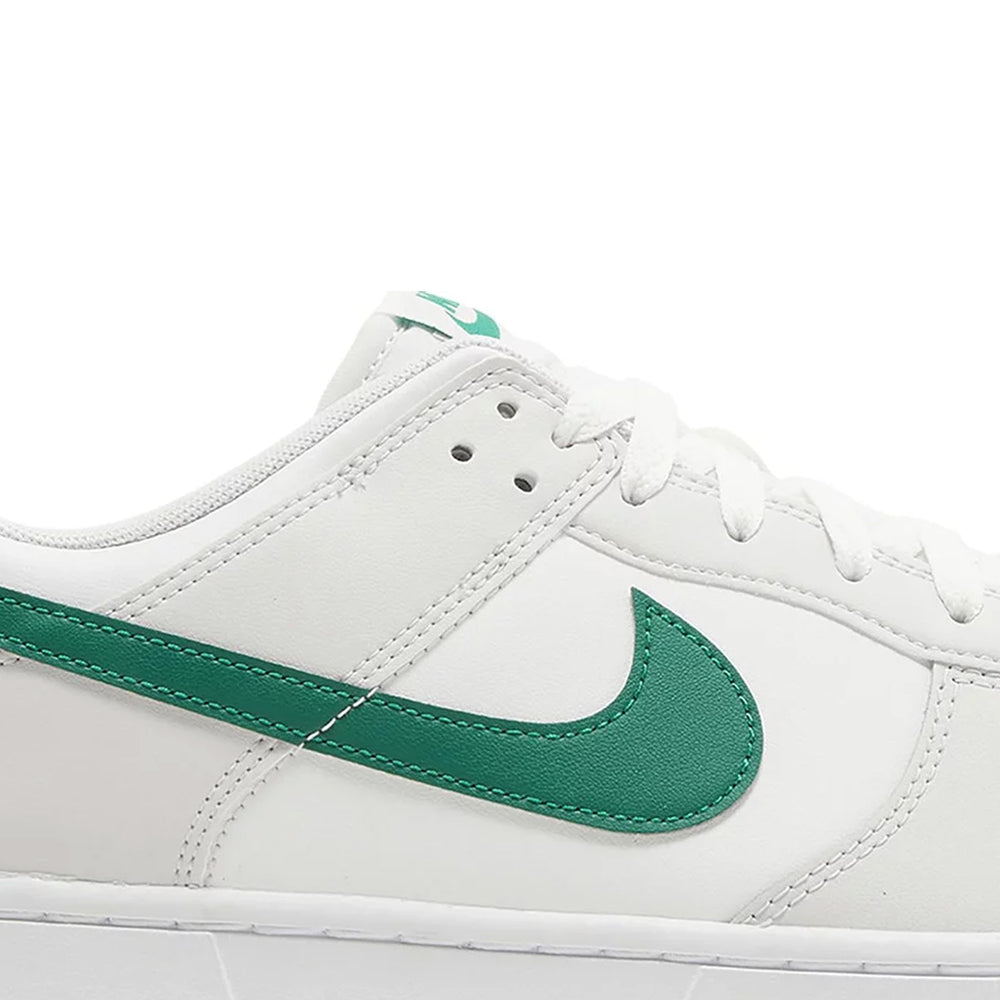 The Nike Dunk Low 'Summit White Malachite' (2024) emerges as a pinnacle of contemporary sneaker design, blending classic Dunk elements with innovative colorways that captivate both collectors and casual enthusiasts alike. Crafted with a crisp 'Summit White' leather upper, this iteration introduces a bold twist with 'Malachite' green overlays that cascade from the eyestays to the heel. The iconic Swoosh branding, rendered in a striking silver, adds a touch of metallic allure, complementing the overall aesthetic with a modern edge.