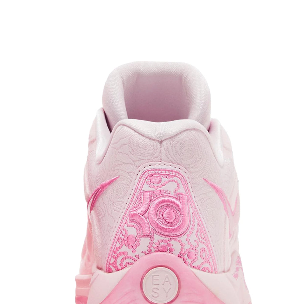 The Nike KD 17 NRG 'Aunt Pearl' (2024) features a striking "White" leather base with pink and purple hues, symbolizing the fight against cancer and embodying the spirit of love and resilience. The upper showcases intricate floral patterns, a nod to Aunt Pearl’s influence on Durant’s life. The signature pink and purple color scheme is complemented by metallic silver accents that add a touch of elegance. The shoe’s Flyknit construction and Zoom Air cushioning offer lightweight support and explosive speed, making this sneaker not only a tribute but also a high-performance on-court asset. The heel counter features a unique pearl-inspired graphic, solidifying the theme and paying respect to Durant's Aunt Pearl.