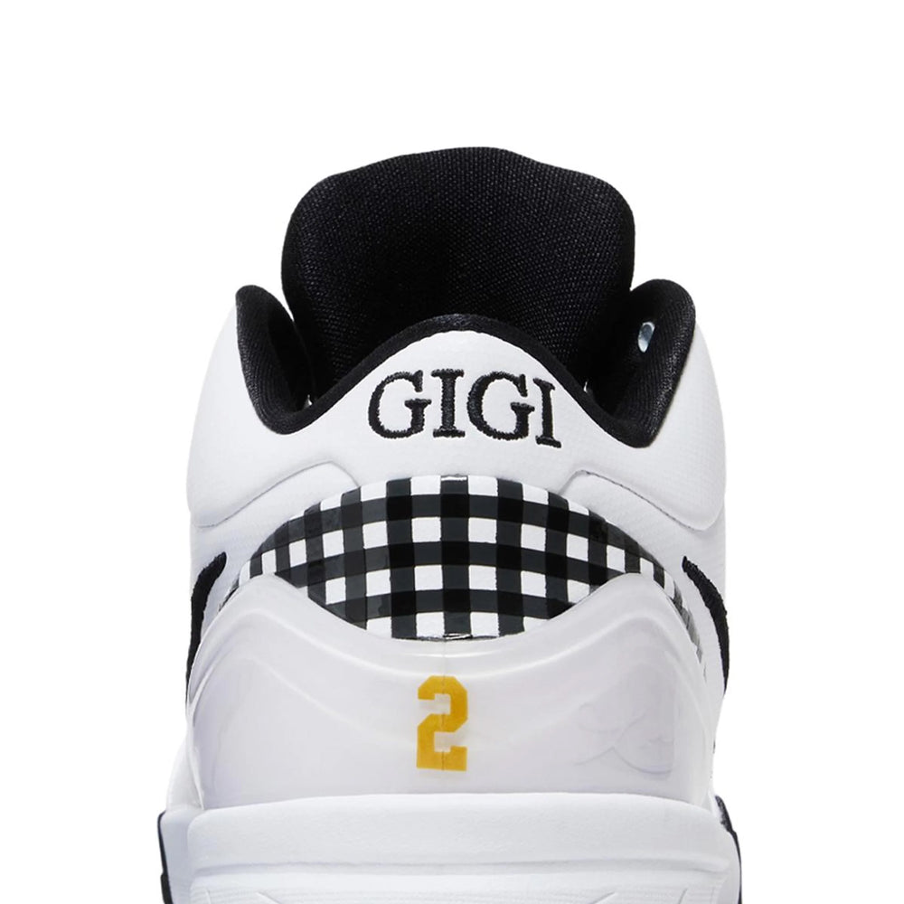 The 'Mambacita Gigi' edition showcases a sleek "White" and "Black" color scheme, with a clean white leather upper accentuated by subtle black details. The shoe features a textured black overlay that recalls the iconic snakeskin pattern associated with Bryant's 'Mamba' persona. A unique touch is found in the "Gigi" inscription on the heel, a heartfelt nod to Kobe's daughter. The sneaker's translucent outsole reveals a distinctive black and white speckled design, enhancing both visual appeal and traction. The innovative Zoom Air cushioning ensures top-tier performance on the court, while the responsive foam midsole delivers comfort and stability. This Protro variant integrates contemporary updates to improve durability and support, making it a fitting homage to the Bryant legacy.