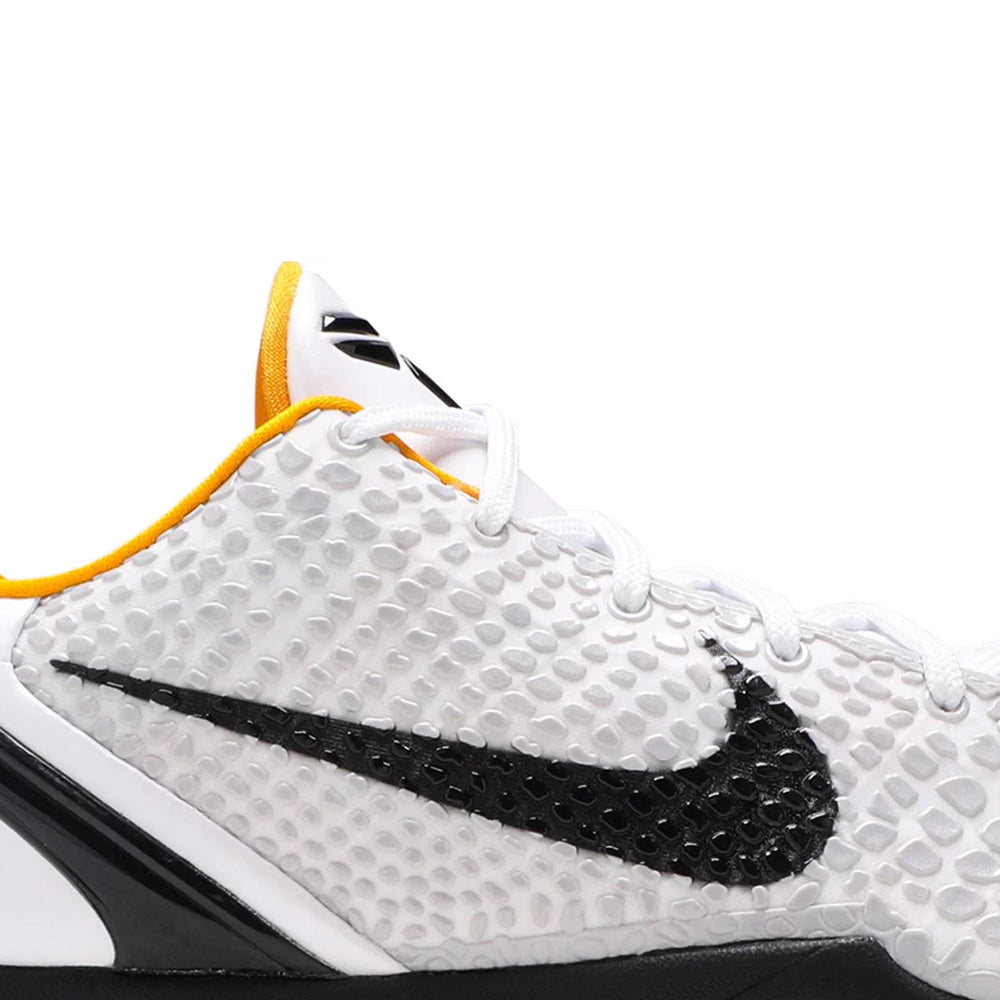 The Nike Kobe 6 Protro Playoff Pack 'White Del Sol' boasts a sleek "White" upper accented by striking "Del Sol" yellow details, creating a visually stunning contrast. The shoe's upper is constructed with a combination of synthetic materials and Flywire technology, offering lightweight support and a snug fit. The signature scaly texture of the upper, inspired by the mamba snake, remains intact, providing both aesthetic appeal and functional grip. Cushioning is redefined with the inclusion of a full-length Zoom Air unit and Phylon midsole, ensuring responsiveness and comfort during intense gameplay. The outsole features a modified herringbone pattern for exceptional traction on the court, making quick cuts and explosive movements effortless.