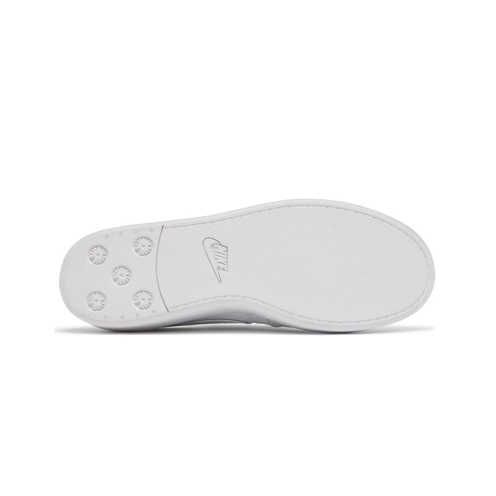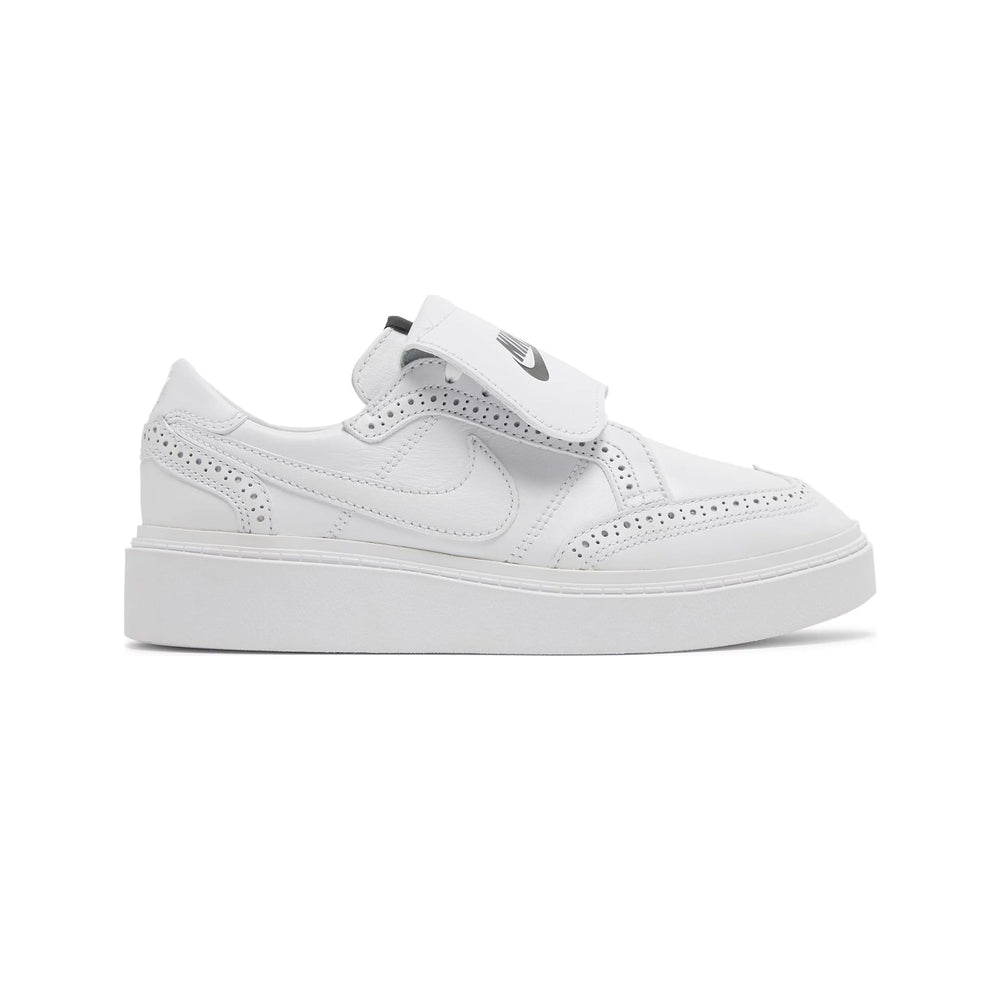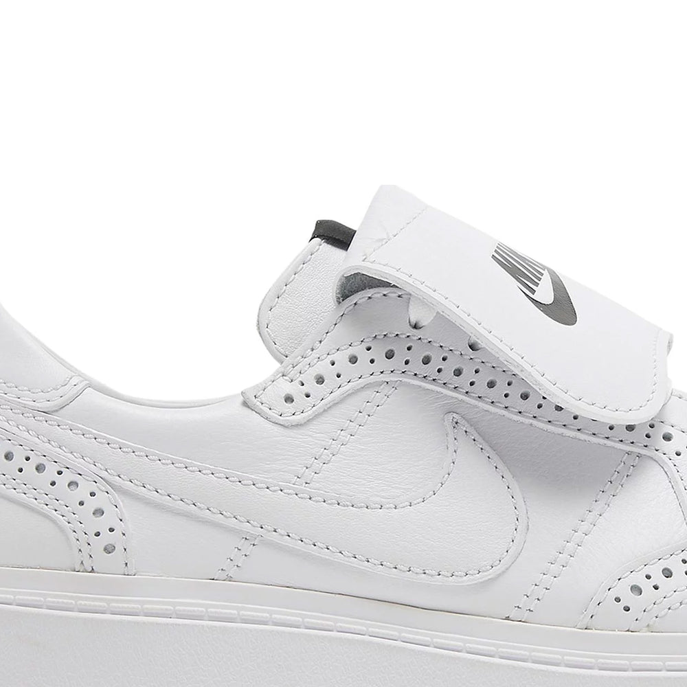Featuring an all-white premium leather upper, the Nike Kwondo 1 x G-Dragon Peaceminusone 'Triple White' stands out with its sleek and minimalist design. The sneaker's brogue-inspired detailing on the toe box and side panels add a touch of sophistication, reminiscent of classic dress shoes. The perforated patterns are not just for aesthetic appeal but also enhance breathability. The signature Peaceminusone daisy logo on the heel tab and tongue injects G-Dragon's distinct artistic flair, while the co-branded insoles underscore the collaborative effort between Nike and G-Dragon's fashion label.