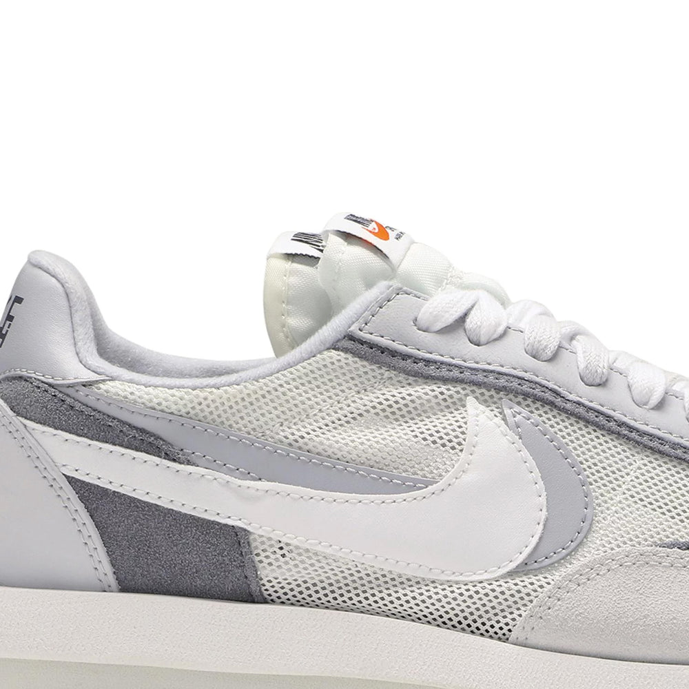 The Nike LD Waffle Sacai 'Summit White' features a meticulous blend of materials and layers, creating a dynamic and textured aesthetic. The upper showcases a combination of white mesh, leather, and suede, offering a sleek yet robust construction. This layered design is complemented by dual tongues, Swooshes, and laces, reinforcing Sacai's signature deconstructed style. The color palette remains understated with varying shades of white and grey, allowing the intricate details to take center stage. The midsole, a blend of two soles, extends slightly at the heel, providing not only a distinctive look but also enhanced comfort and support. The co-branded tongue tags and insole logos highlight the collaboration's exclusivity, making it a coveted piece for sneaker enthusiasts.