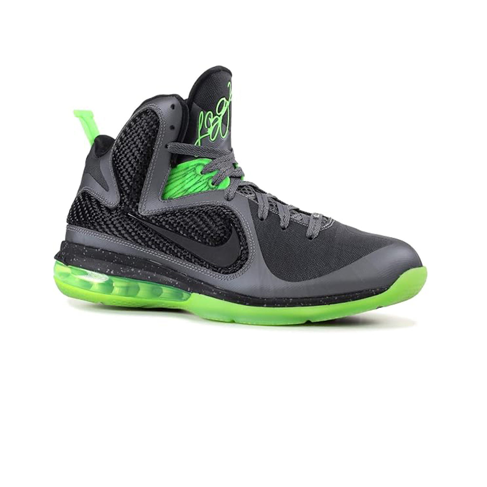 The Nike LeBron 9 'Dunkman' (2012) solidifies its status as one of the most iconic releases in LeBron James' signature line, merging high-performance design with bold, eye-catching aesthetics. This celebrated colorway pays homage to LeBron's explosive athleticism, encapsulated in the vibrant "Dunkman" theme. Overview The sneaker features a striking "Black and Metallic Silver" base complemented by electrifying "Mean Green" accents throughout. Hyperfuse technology ensures a lightweight, breathable upper, while Flywire cables provide enhanced support for dynamic movements. The "Dunkman" logo, a signature emblem symbolizing LeBron’s gravity-defying dunks, adorns the heel and tongue, adding a touch of exclusivity. Underfoot, a 180-degree Max Air unit delivers unparalleled cushioning, ensuring comfort during intense gameplay or casual wear. The outsole incorporates a translucent design with a "Mean Green" glow, enhancing the sneaker's visual appeal and reinforcing its status as a must-have for collectors and athletes alike. Key Highlights • Vibrant 'Dunkman' Theme: Features the iconic "Mean Green" accents and the signature Dunkman logo, celebrating LeBron's athletic dominance. • Advanced Hyperfuse and Flywire Construction: Combines lightweight breathability with durable support, making it ideal for on-court performance. • Max Air Cushioning Technology: Provides exceptional impact protection and all-day comfort.