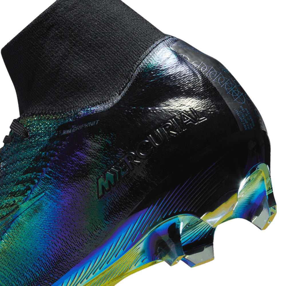 The Nike Mercurial Superfly 10 Elite FG 'Iridescent' features a Flyknit upper that molds seamlessly to the foot, offering a sock-like fit for ultimate comfort and stability. Nike’s All Conditions Control (ACC) technology ensures reliable touch and control in both wet and dry conditions, making it suitable for unpredictable weather. The cleat’s dynamic fit collar delivers additional ankle support, enhancing flexibility without compromising speed. Its iridescent finish gives the shoe an eye-catching, futuristic look, adding a layer of flair to its already high-performance design.