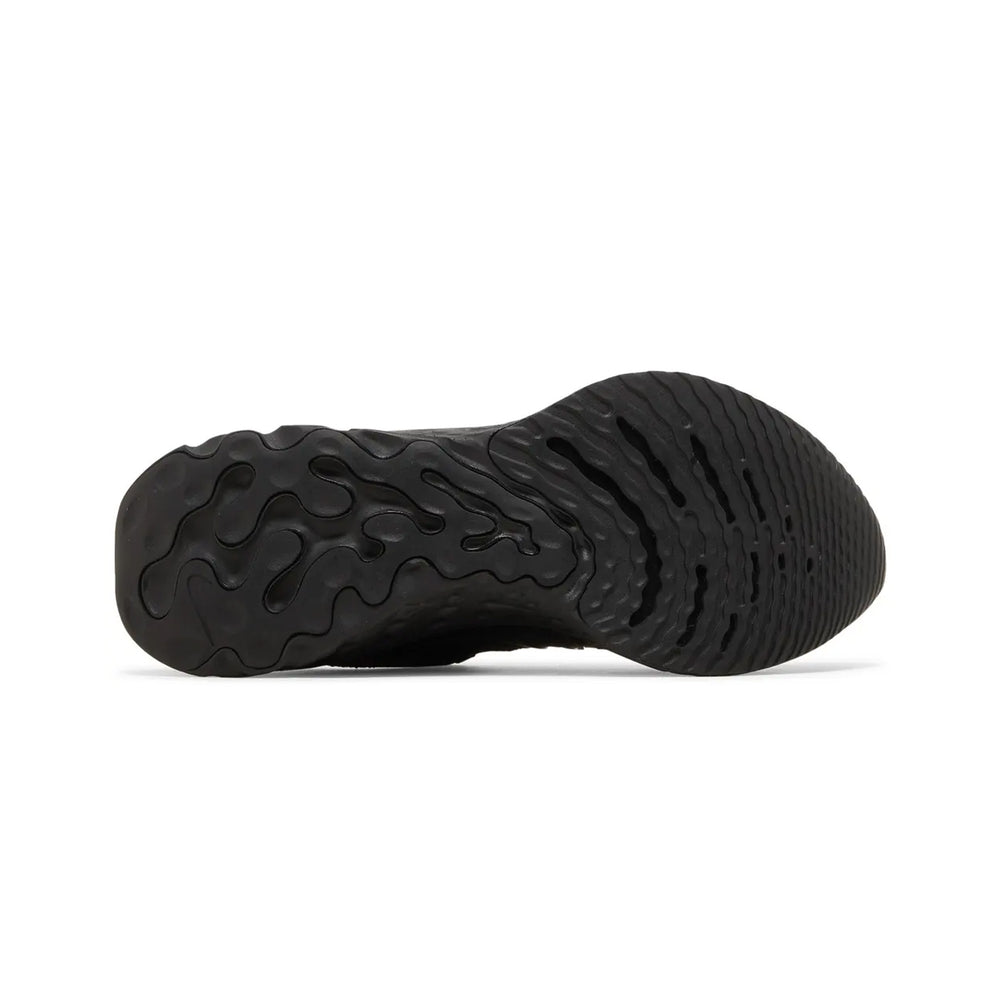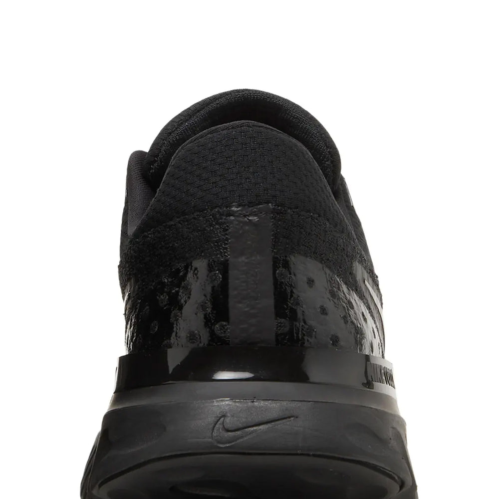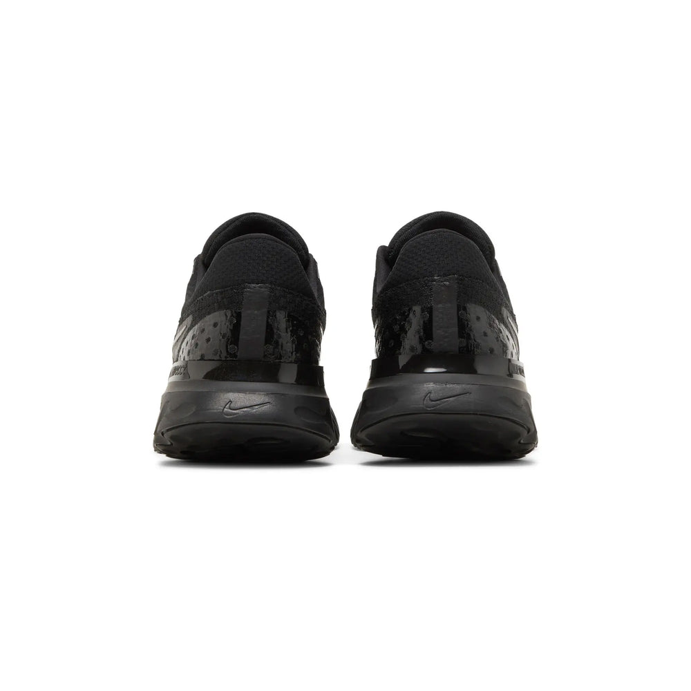 The Nike React Infinity Run Flyknit 3 'Triple Black' showcases an engineered Flyknit upper, providing a sock-like fit that supports every stride while offering breathability. The midsole features Nike’s React foam, known for its lightweight, responsive cushioning, designed to reduce the risk of injury and offer a smooth, stable ride for long-distance runs. The sleek, black-on-black color scheme gives the shoe a modern and minimalist appeal, with subtle branding details like the Swoosh on the side and the Nike React logo on the heel tab. A rubber outsole with strategically placed traction points offers superior durability and grip, whether you're on the road or hitting the pavement.