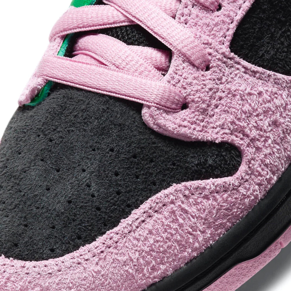 The 'Invert Celtics' Dunk High stands out with its dual-personality design. One side showcases the traditional green and white leather synonymous with the Boston Celtics, reflecting the team's storied legacy. Contrastingly, the other side flips expectations with an eye-catching combination of vibrant pink and black suede. This unique juxtaposition not only sets it apart visually but also emphasizes Nike's commitment to innovation and creativity. The high-top silhouette provides ample ankle support, while the perforated toe box ensures breathability. Nike's attention to detail is evident in every stitch, from the padded collar to the durable rubber outsole, designed to withstand the rigors of skateboarding while offering exceptional grip.