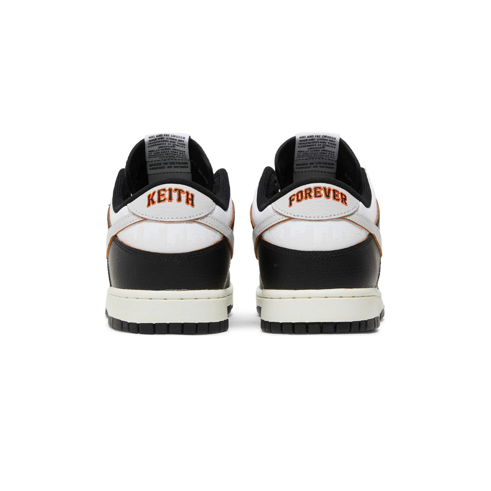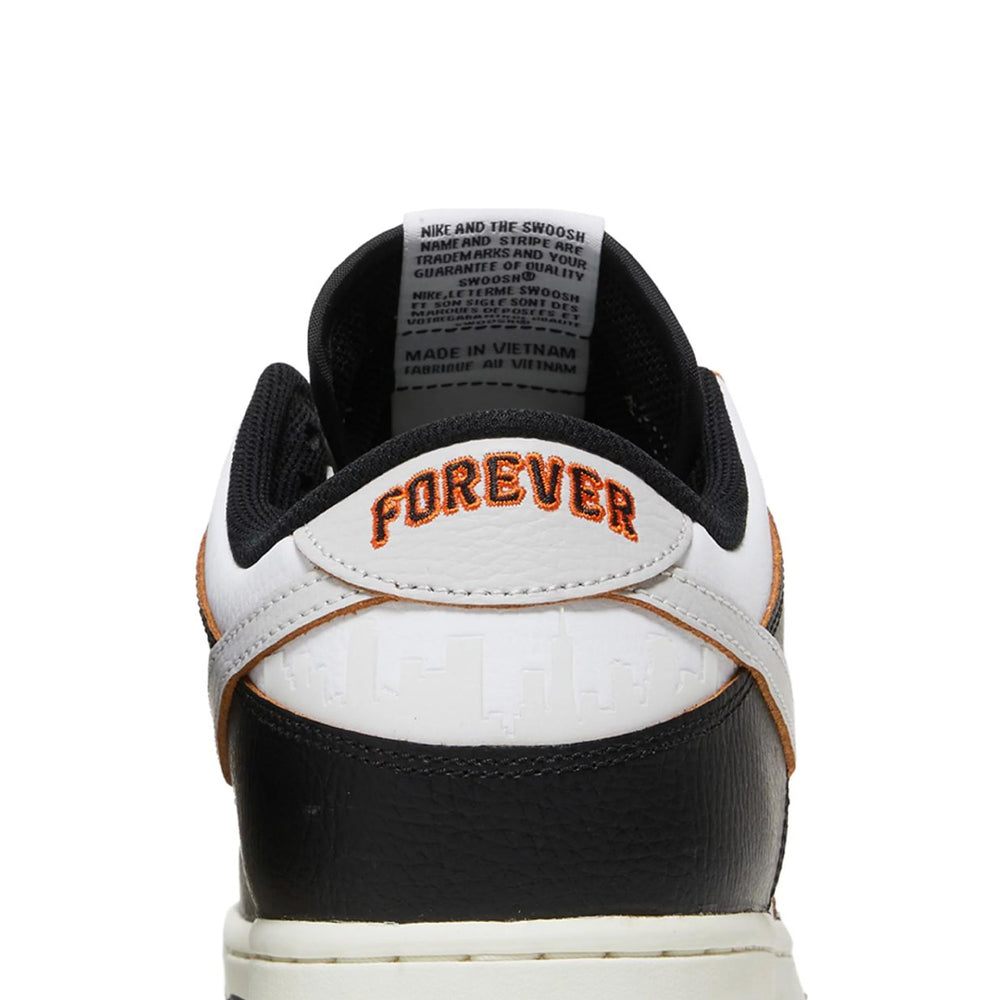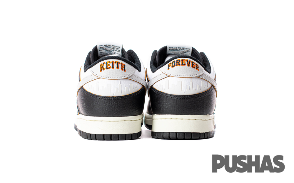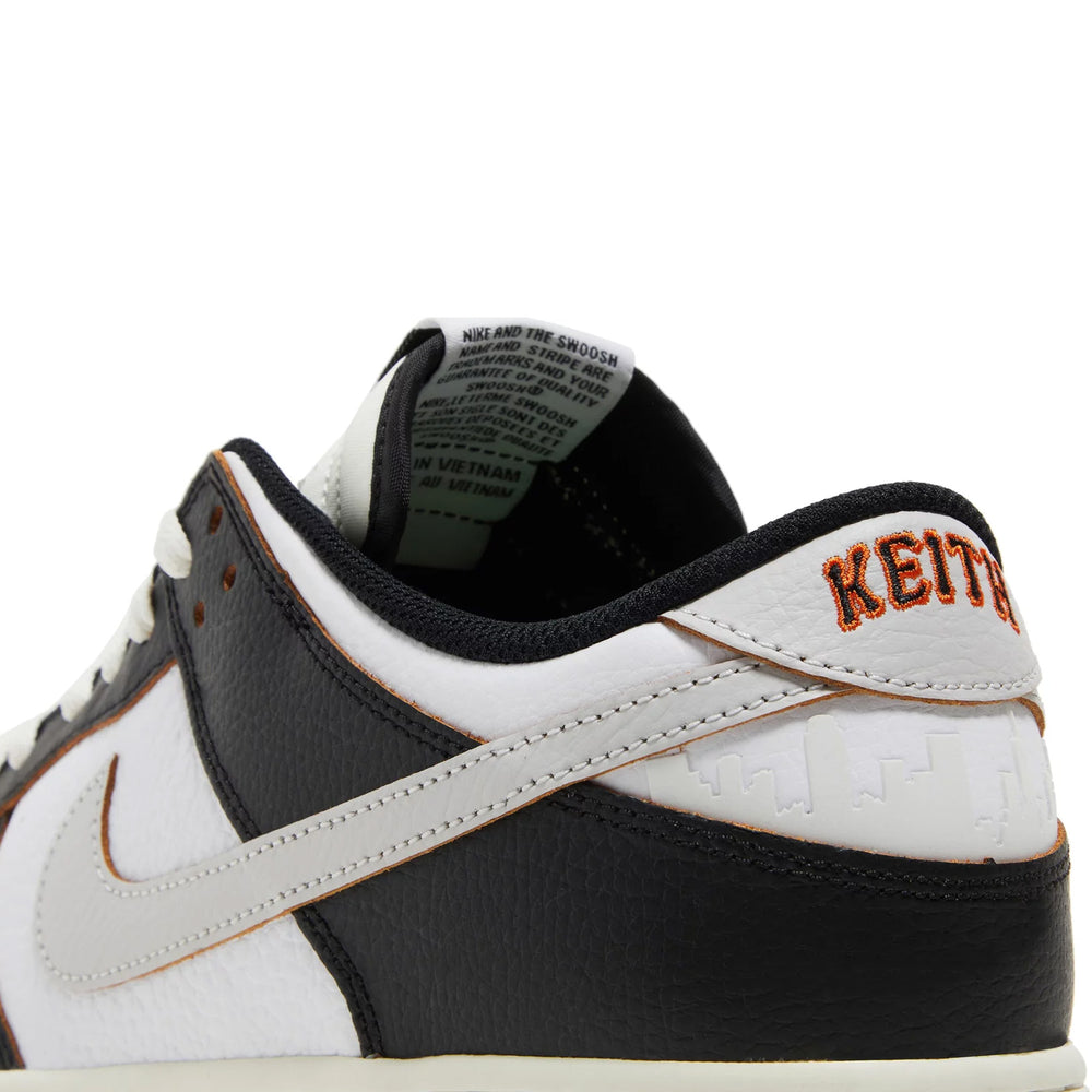 The sneaker features a sophisticated black leather upper, contrasted with white leather overlays that add a crisp, clean aesthetic. This design nods to the original colorways of the HUF Dunks from 2004, embodying a timeless yet contemporary appeal. The toe box is perforated for breathability, while the quarter panel boasts the 'City Pack' theme, highlighted by the signature San Francisco skyline printed on the heel panel. The 'HUF' branding is embroidered on the toe, and a unique 'Keith Forever' message is hidden beneath the tear-away leather on the toe box, a heartfelt tribute to the late founder. The Nike SB Dunk Low x HUF 'San Francisco' also includes a co-branded tongue tag and an extra pair of shoelaces for customization.