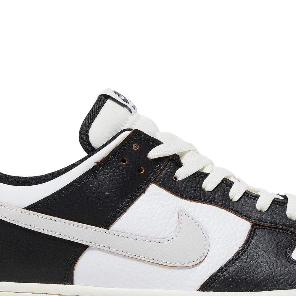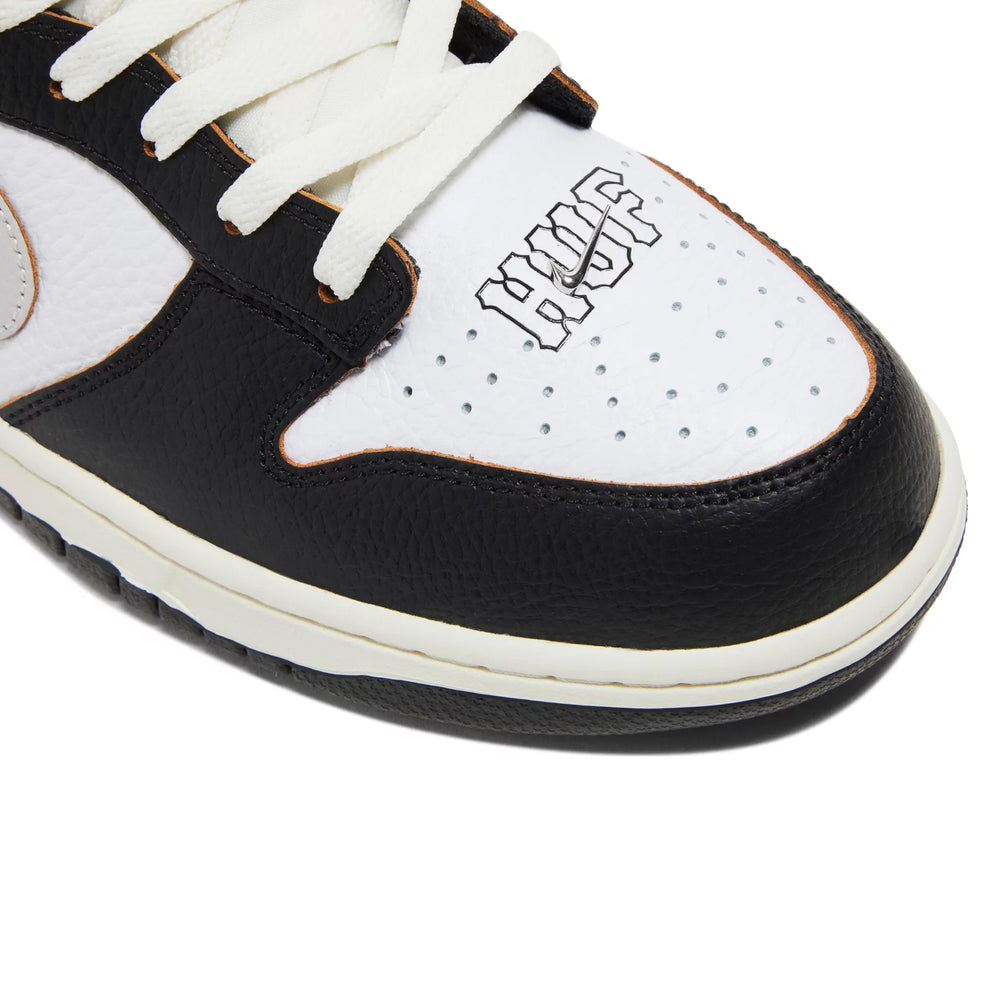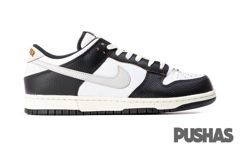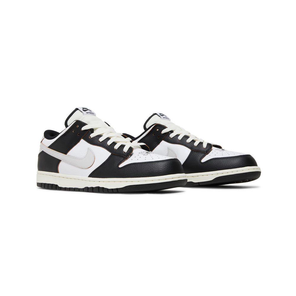 The sneaker features a sophisticated black leather upper, contrasted with white leather overlays that add a crisp, clean aesthetic. This design nods to the original colorways of the HUF Dunks from 2004, embodying a timeless yet contemporary appeal. The toe box is perforated for breathability, while the quarter panel boasts the 'City Pack' theme, highlighted by the signature San Francisco skyline printed on the heel panel. The 'HUF' branding is embroidered on the toe, and a unique 'Keith Forever' message is hidden beneath the tear-away leather on the toe box, a heartfelt tribute to the late founder. The Nike SB Dunk Low x HUF 'San Francisco' also includes a co-branded tongue tag and an extra pair of shoelaces for customization.