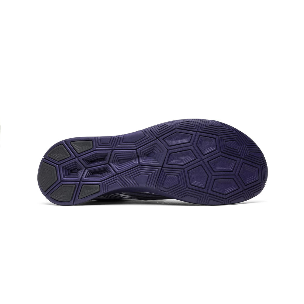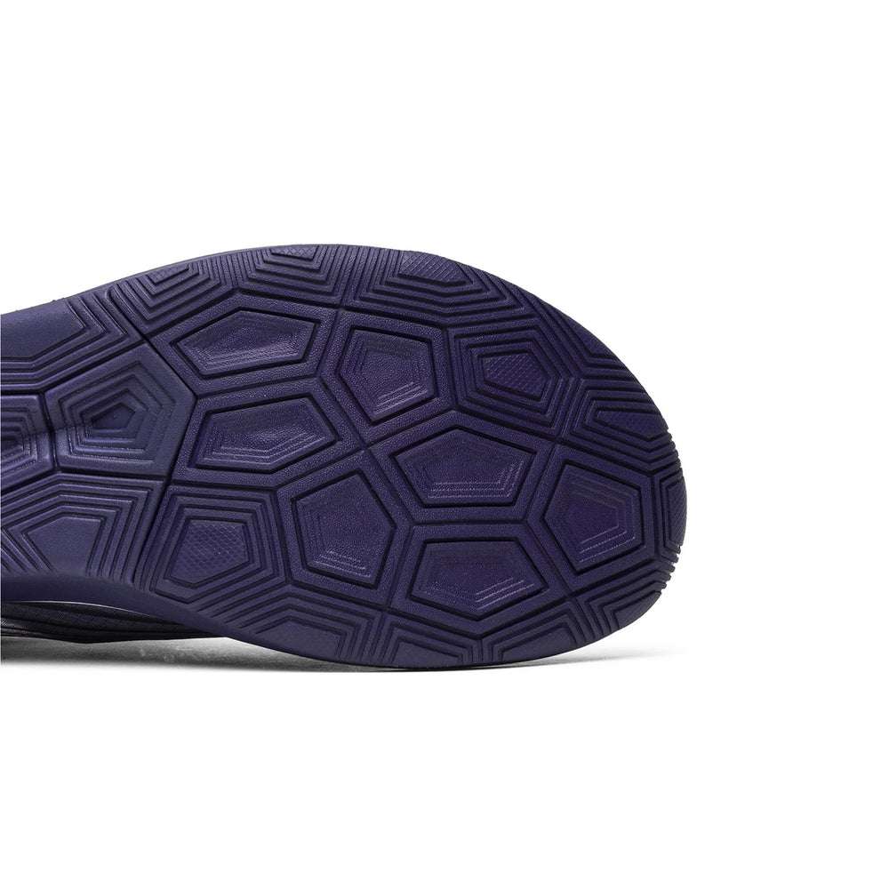 The Nike Zoom Fly 'Undercover Gyakusou Ink' features a lightweight translucent upper that is both breathable and supportive, making it ideal for long-distance running. The "Ink" colorway is characterized by deep, moody tones of navy and black, with contrasting white Swooshes that add a striking visual element. Unique to this collaboration are the bold "GYAKUSOU" branding on the lateral side and the "RUNNING" text on the midsole, which underscore the shoe's dual-purpose design. The full-length carbon-infused nylon plate embedded within the midsole offers a responsive, propulsive feel, enhancing performance on the track or pavement. The ZoomX foam cushioning provides superior comfort, absorbing impact while delivering energy return with every stride.
