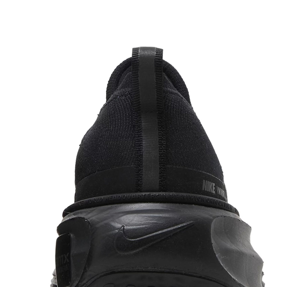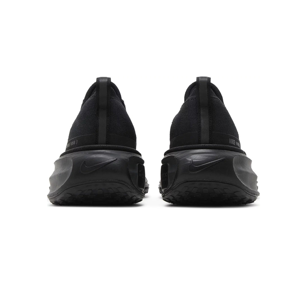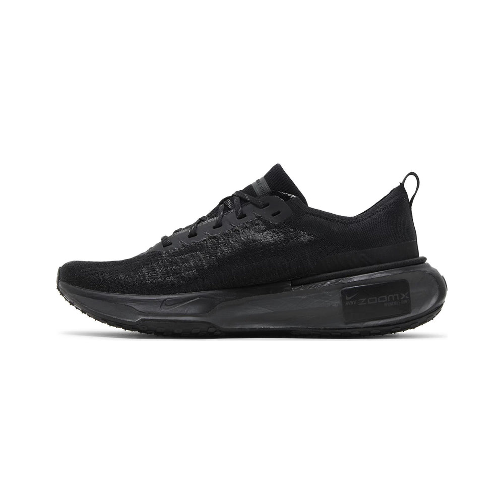 The Nike ZoomX Invincible Run 3 'Black' is constructed with Nike's renowned ZoomX foam, which is engineered to deliver maximum energy return and cushioning with every stride. The upper features a lightweight, breathable mesh that adapts to the foot's shape, providing a secure yet flexible fit. The black colorway is accented with subtle details, including reflective elements for enhanced visibility during low-light conditions. The shoe’s rocker geometry ensures smooth transitions, helping to reduce strain on the legs and allowing for a more efficient running experience. The wide, exaggerated midsole not only adds to the shoe's stability but also contributes to its bold, modern aesthetic.