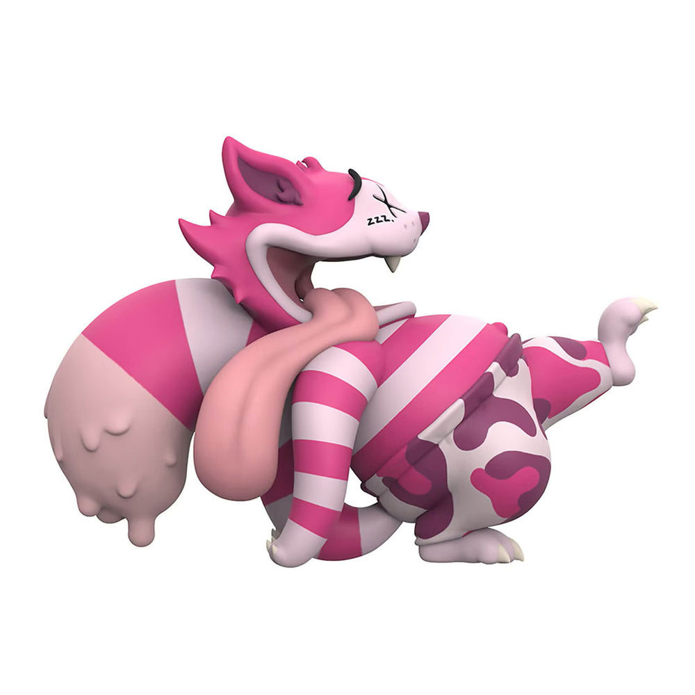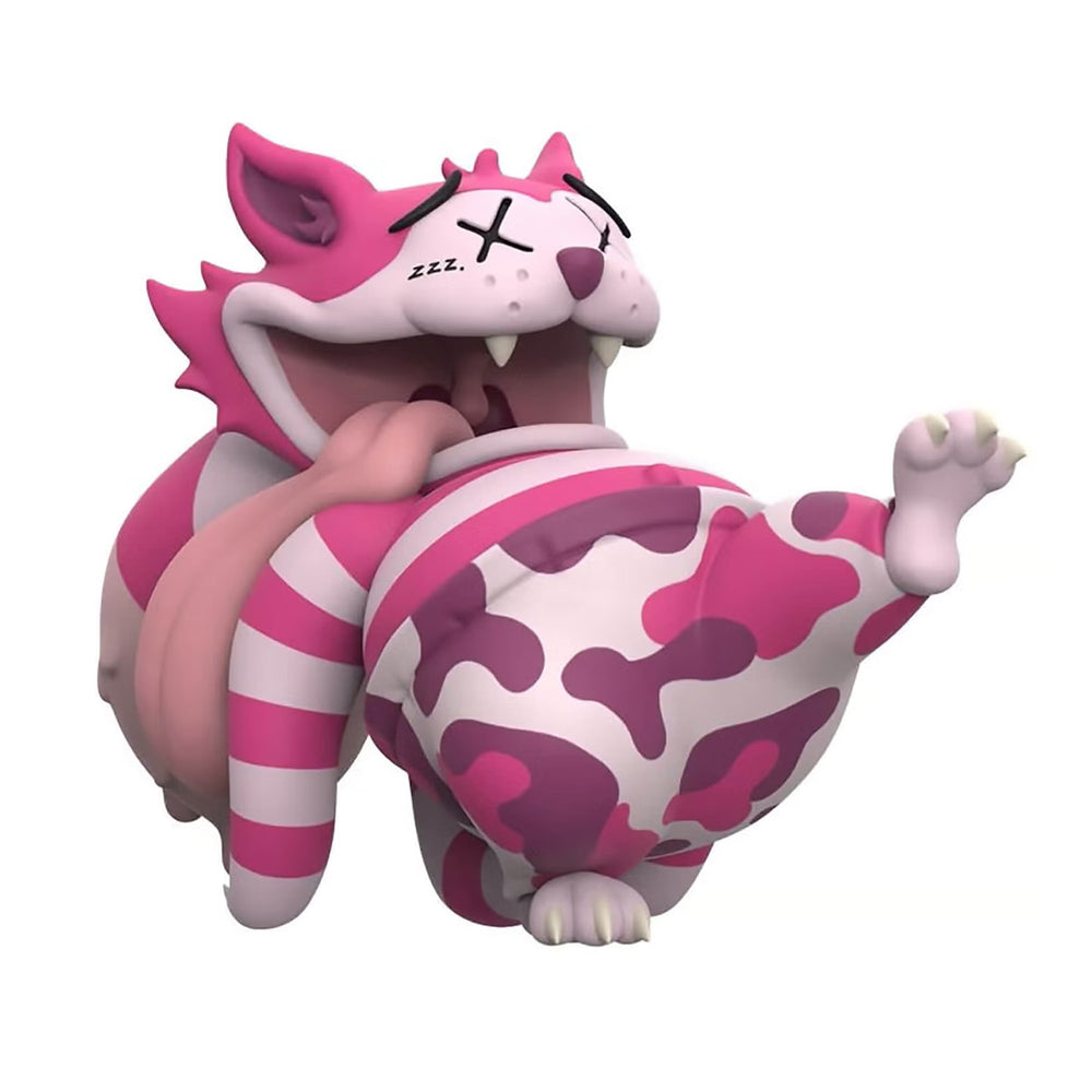 Product Specifications 6" Tall 9", Wide Vinyl Art Toy Limited Edition Description Your imagination isn’t playing tricks on you. Can you believe in 6 impossible things before the tea party? See here is a cat, with a grin so wide his uvula is as apparent as the sky is blue. Here is a cat that isn’t black, brown, or white - but striped in hues of pink with pink camo pants. Here is a cat, whose grin is so wide his long heavy tongue droops out and drags behind. Here is a cat that walks on 2 legs because of a droop so swag. Here is a cat with crossed-out eyes but with the ability to see beyond. Here is a cat leading the way, as parts of him droop off his tail.