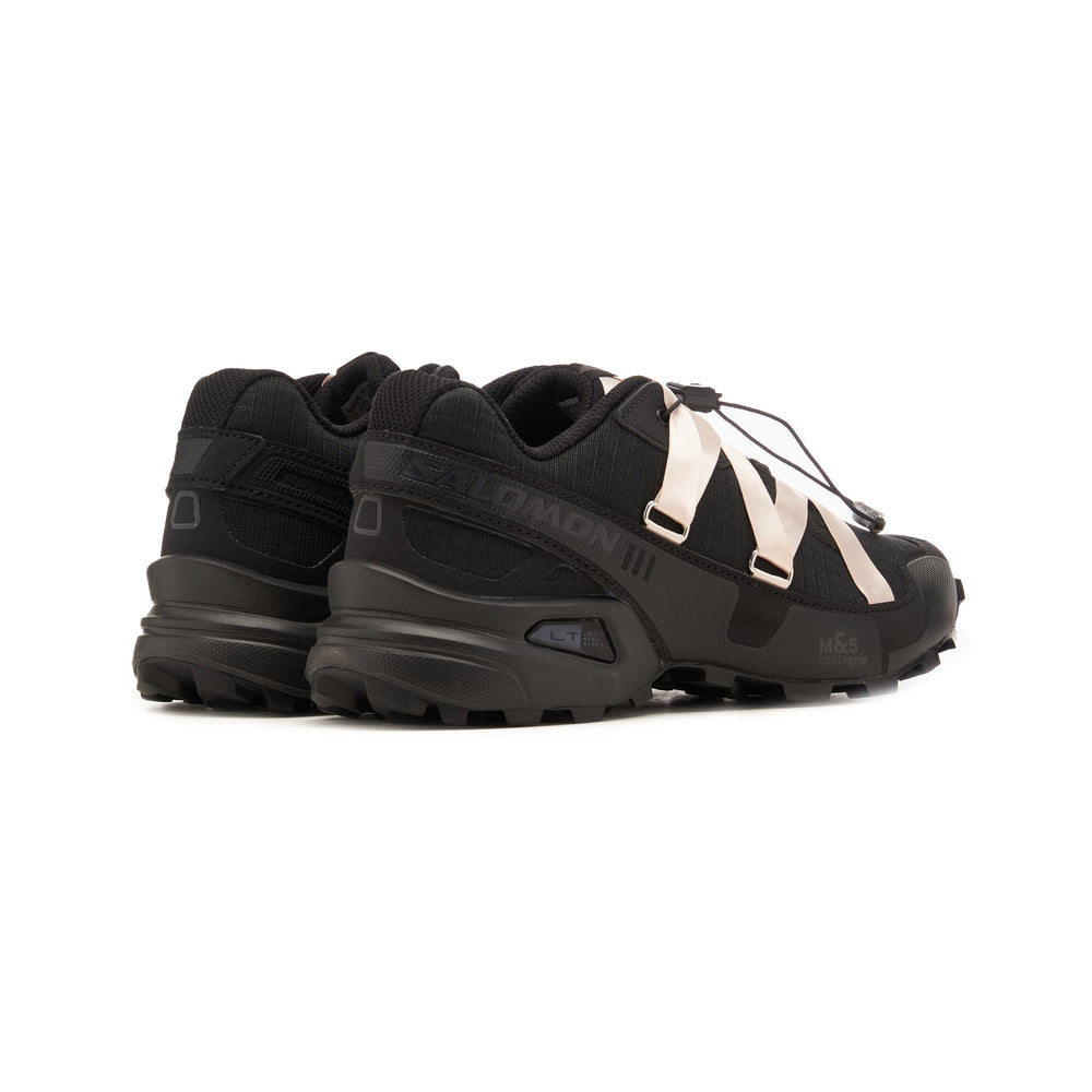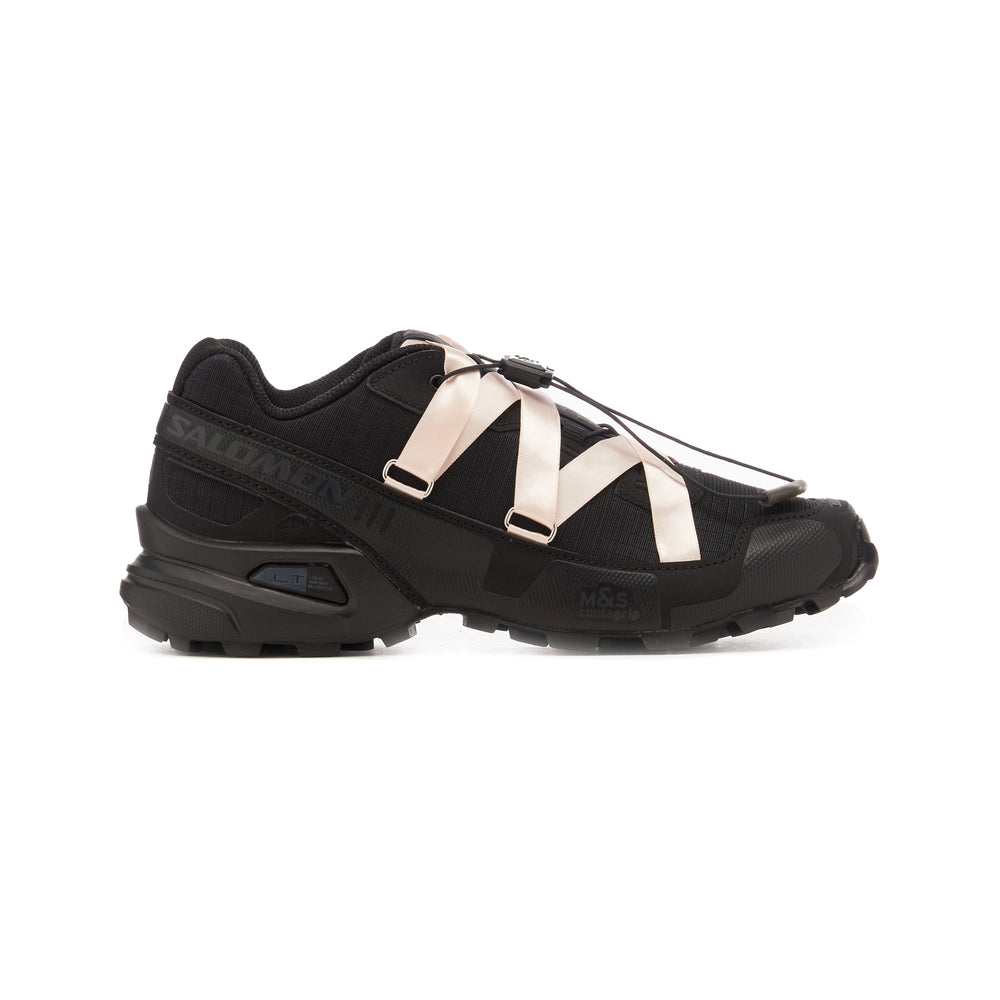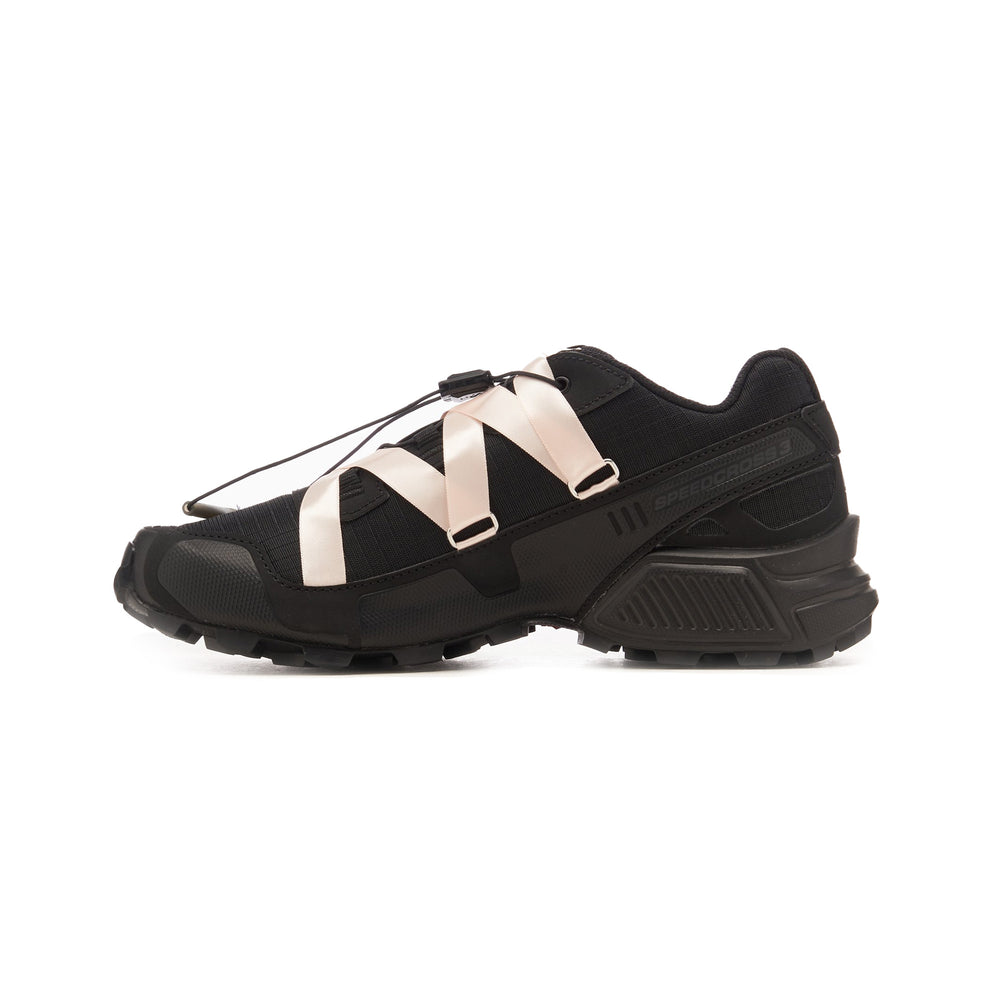 The Salomon Speedcross 3 Ribbon Sandy Liang 'Black Pink' features a dynamic black and pink colorway that exudes contemporary flair while retaining the robust performance qualities that the Speedcross line is known for. The shoe is constructed with a durable black mesh upper, complemented by striking pink accents on the laces, eyelets, and midsole, delivering both style and function. Sandy Liang's signature ribbon detailing adds a touch of elegance and uniqueness, setting this model apart from conventional trail-running shoes. The shoe's design is rounded out with Salomon's iconic Contragrip outsole, ensuring superior traction on all surfaces, and the Sensifit system for a snug, secure fit.