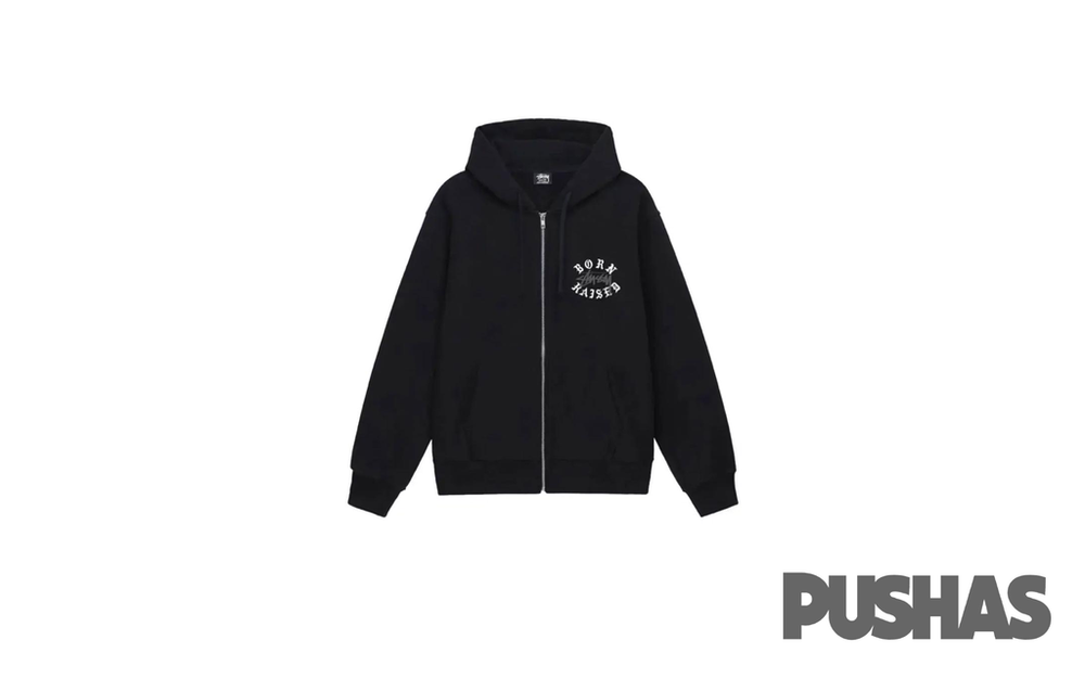 In short, the Stussy x Born & Raised Logo Zip Hoodie in 'Black' is style and quality combined. Elevate your streetwear game with this iconic hoodie that celebrates fashion and urban culture. Don't miss out on this exclusive release, a true reflection of style and street culture.